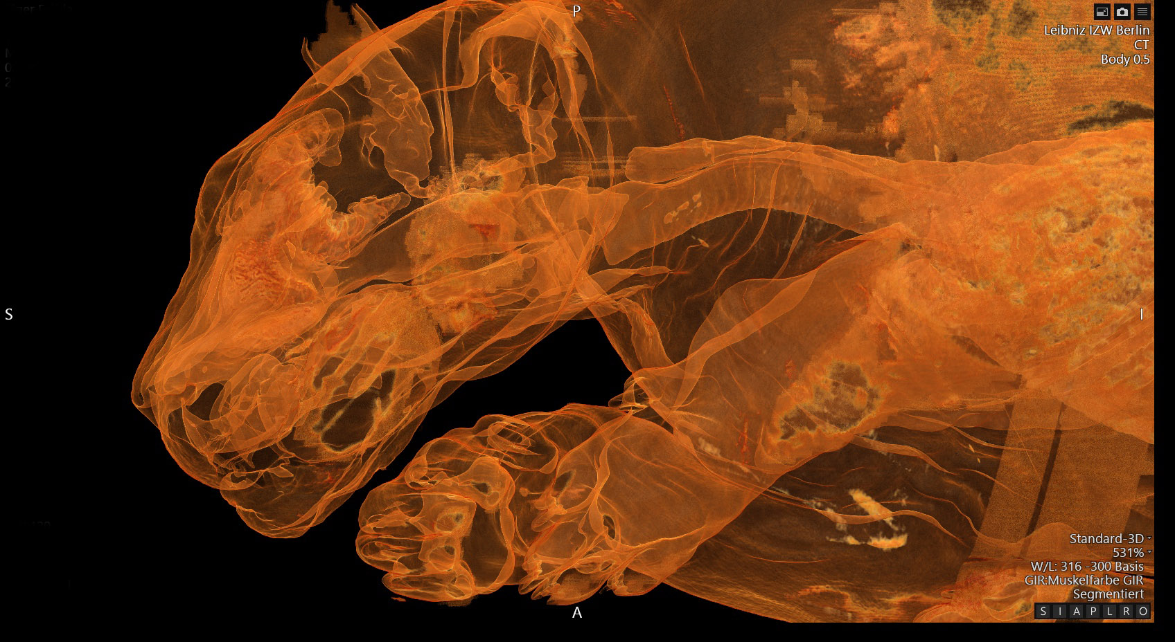 Computed tomography at the Leibniz-IZW - an unusual insight into wild animals and fossils: using state of the art imaging, from classic representation of morphology to the visualization of dynamic processes, we answer clinical as well as scientific questions regarding animal welfare, veterinary clinical diagnostics, and basic research.